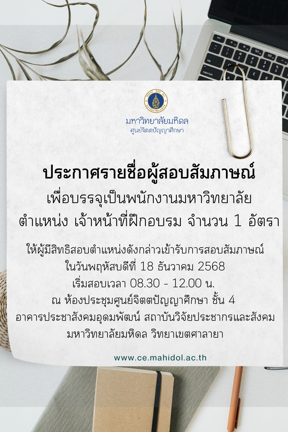 ให้ผู้มีสิทธิสอบต าแหน่งดังกล่าวเข้ารับการสอบสัมภาษณ์ในวันพฤหัสบดีที่ 18 ธันวาคม 2568  เริ่มสอบเวลา 08.30 – 12.00 น. ณ ห้องประชุมศูนย์จิตตปัญญาศึกษา ชั้น 4 อาคารประชาสังคมอุดมพัฒน์ สถาบันวิจัยประชากรและสังคม มหาวิทยาลัยมหิดล วิทยาเขตศาลายา