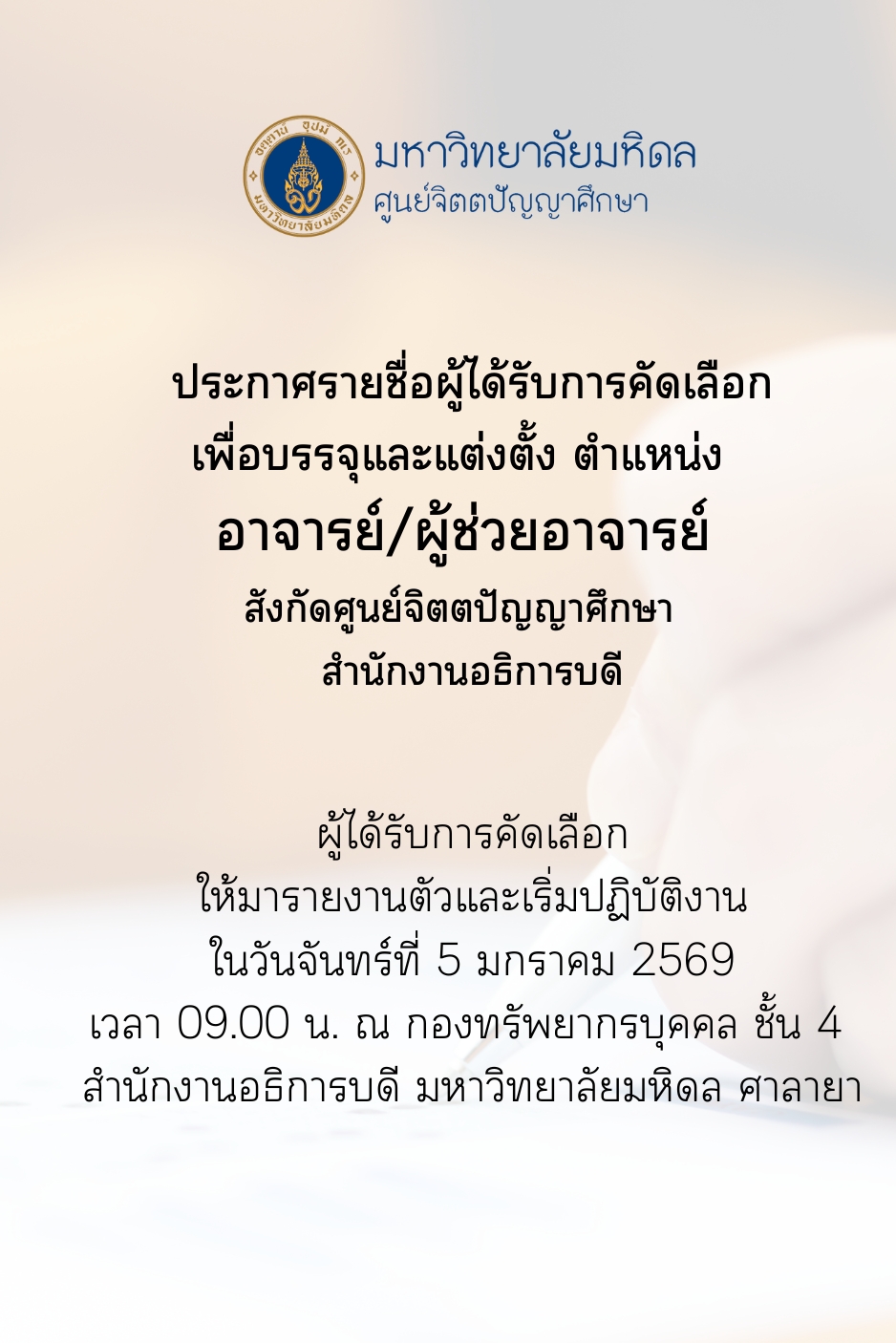 ทั้งนี้ให้ผู้ที่ได้รับคัดเลือกตำแหน่งดังกล่าวมารายงานตัวและเริ่มปฏิบัติงานในวันจันทร์ที่ 5 มกราคม พ.ศ. 2569  เวลา 09.00 น. ณ กองทรัพยากรบุคคล ชั้น 4 ส านักงานอธิการบดี มหาวิทยาลัยมหิดล ศาลายา